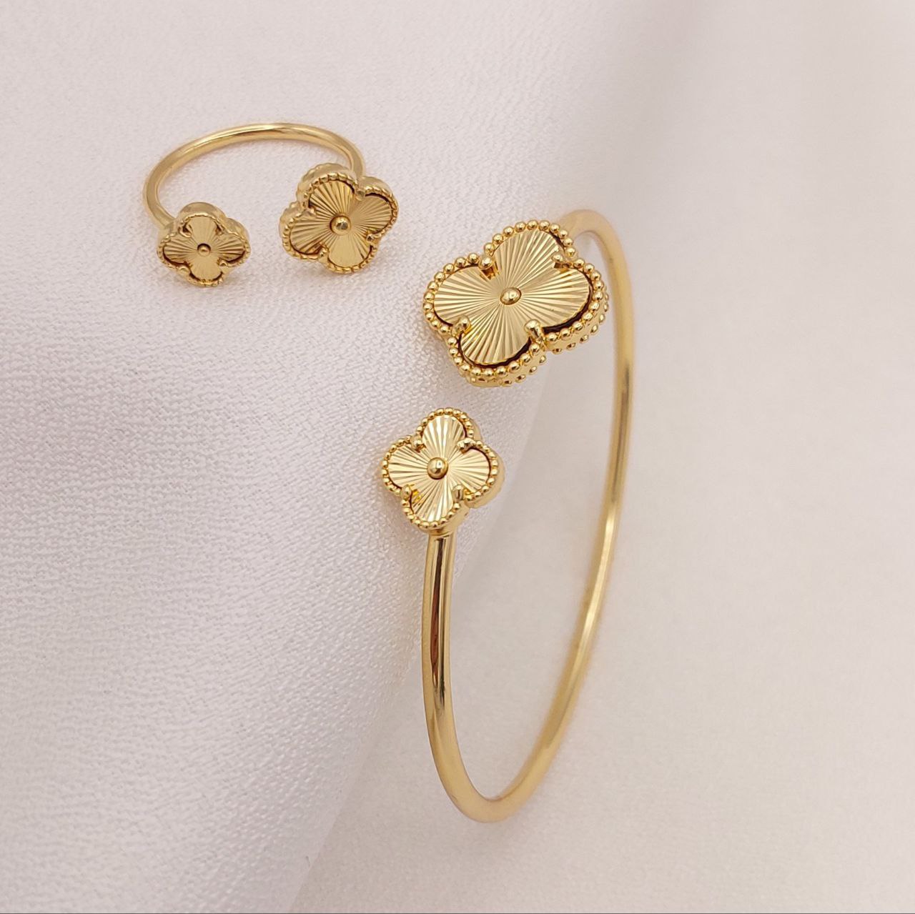 😍خرید ست دستبند بنگل و انگشتر ونکلیف دو گل –❤️ فری سایز و کپی طلا |👑 خاصزیور کد 1088