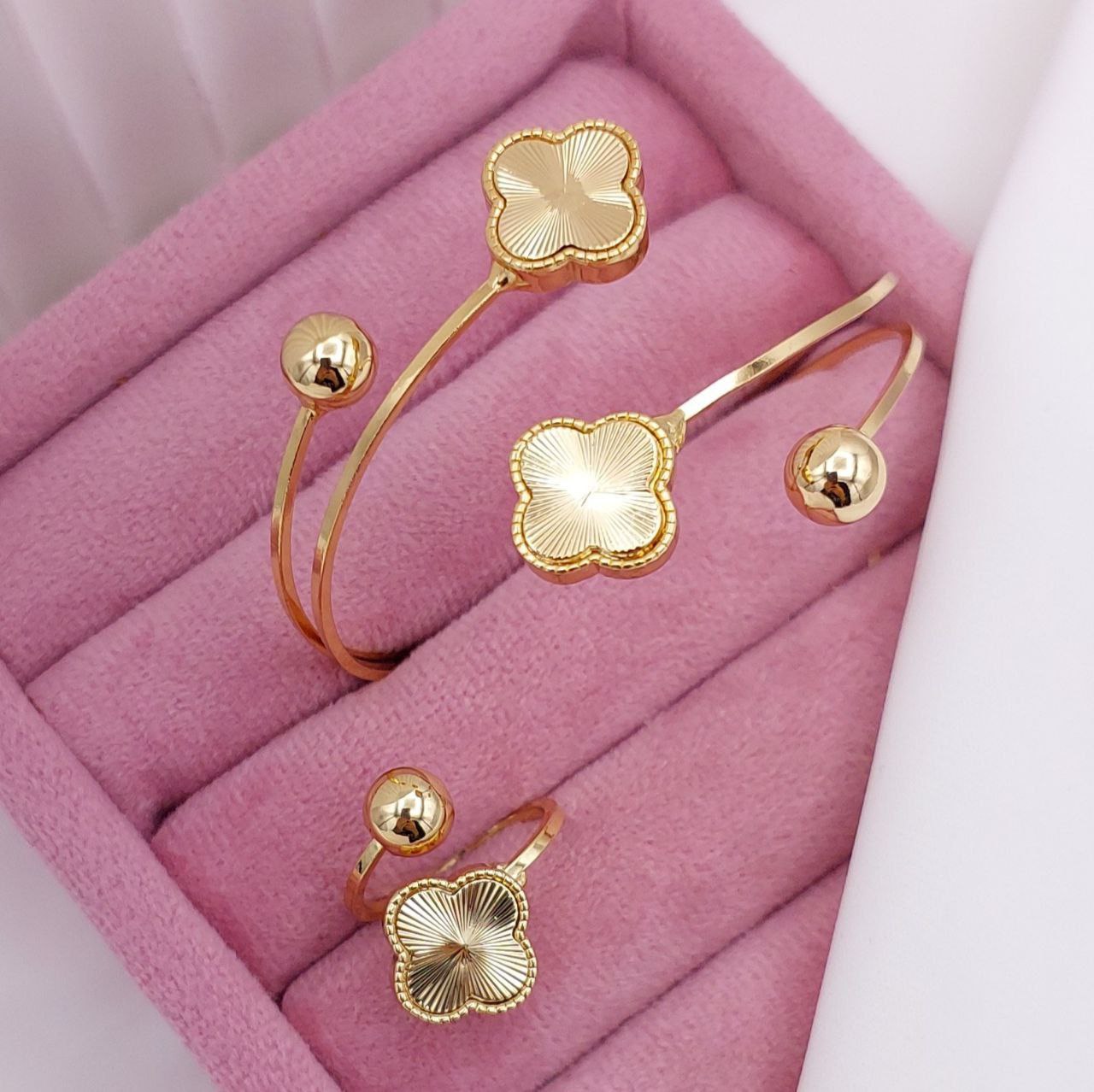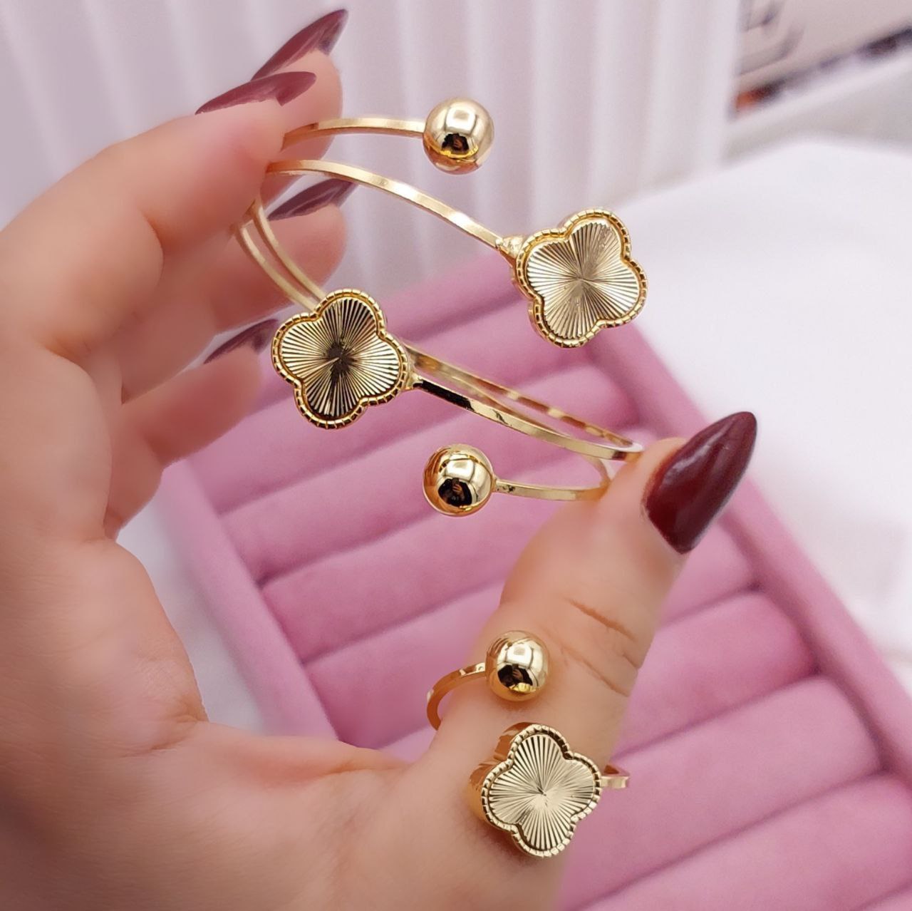 ♦️چرا؟ چون طراحی این ست “باز” است. دایرههای بسته نماد چرخه تکرار هستند، اما دایره باز (Open Circle) که در این دستبند و انگشتر میبینیم، اجازه میدهد انرژی آزادانه جریان یابد. شبدر چهارپر (نماد شانس و ساختار مادی) در یک سو، و گوی طلایی (نماد وحدت و تمرکز) در سوی دیگر، یک میدان مغناطیسی از جذب ثروت و آرامش ایجاد میکنند.